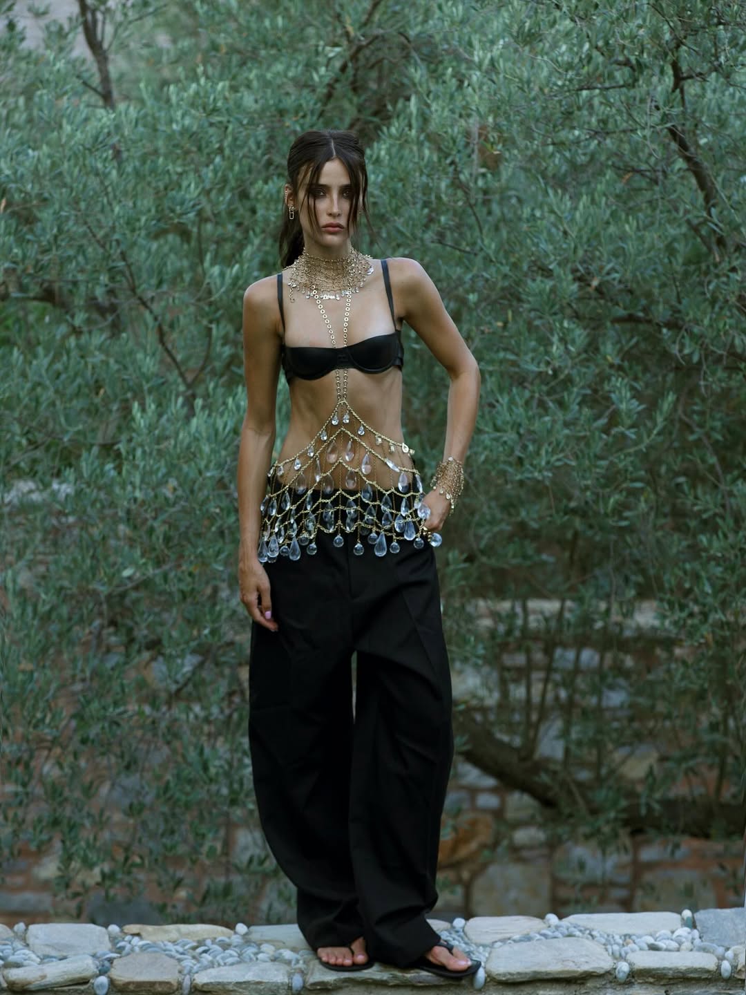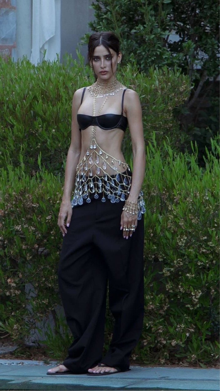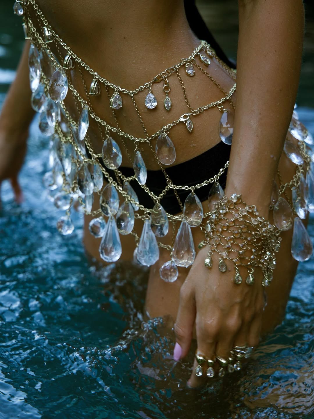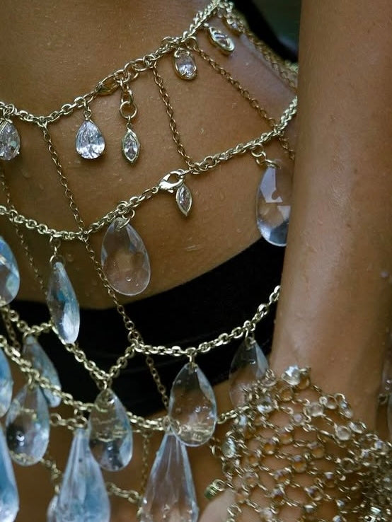 Our Body Bijoux is a statement, layerable and can be worn a plethora of ways — handcrafted with golden links and cascading teardrops crystals. This piece sculpts the body dramatically ease